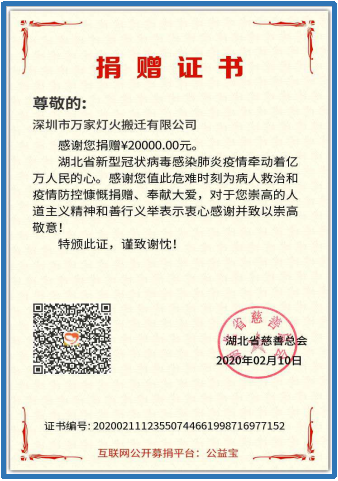 國家面臨如此災難,豈能無動于衷,慈烏反哺,是時候回報國家的時候,經過領導層溝通,萬家燈火搬家公司決定向湖北慈善總會捐獻20000元人民幣,涓涓細流匯聚大海,希望國家盡快戰(zhàn)勝瘟疫。