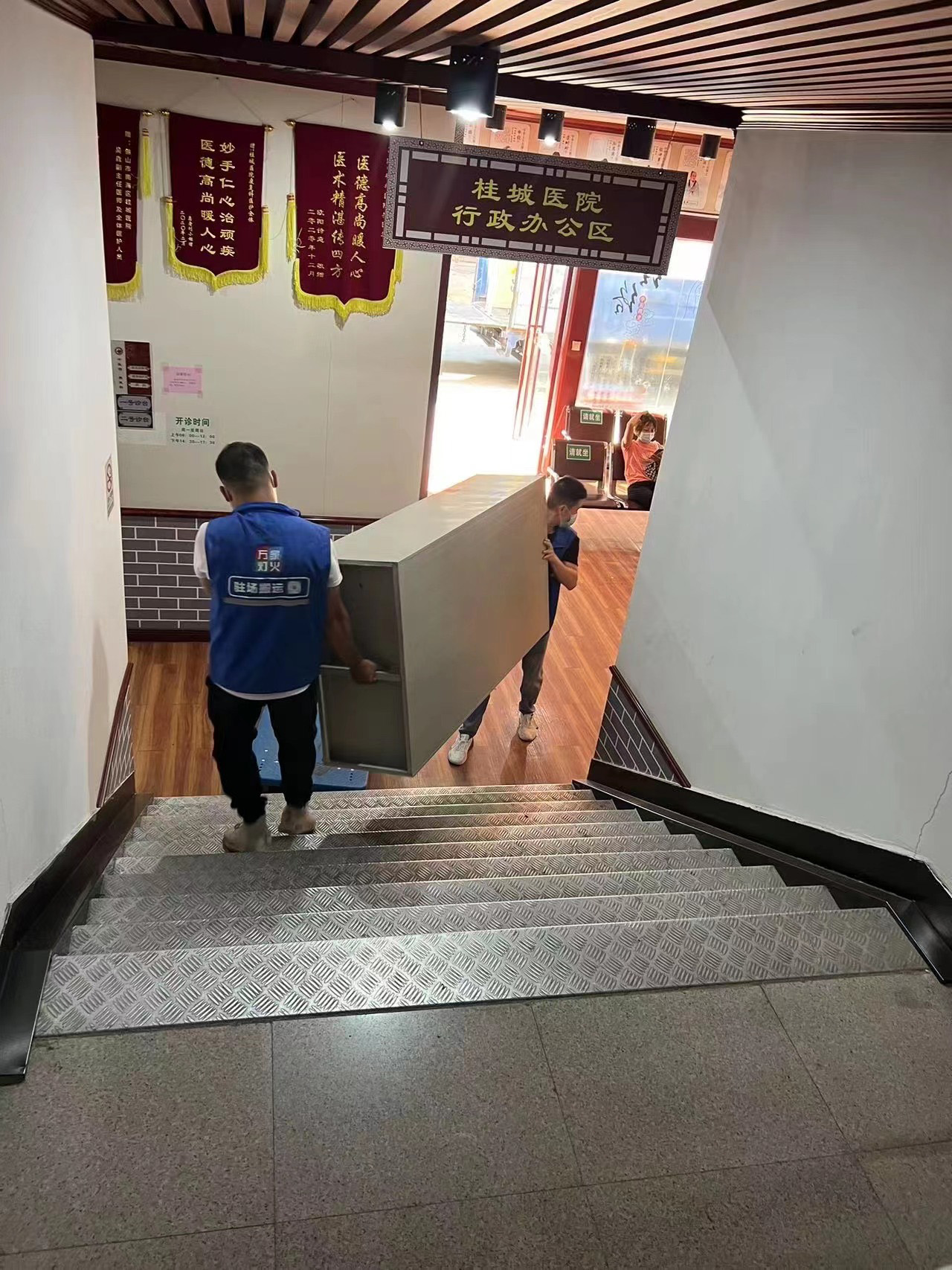 12月1日早上,桂城醫(yī)院內(nèi)本就停車緊張的停車場內(nèi)停滿了萬家燈火的貨運車輛。20多名搬運人員身穿藍色的工衣,手戴白色的防滑手套,在滿是白大褂的醫(yī)院里顯得格外耀眼。只見工人們有序的在搬運各類物品,醫(yī)療設備、電腦資料等。其中有一臺檢驗設備重達900公斤,由于尺寸較大需走樓梯搬運下樓,電梯無法進入。工人們將設備打包固定好后,現(xiàn)場主管下達口令一聲“起”,工人們將設備抬起來,歷時1個小時,最終順利安全將設備搬運下樓裝車。