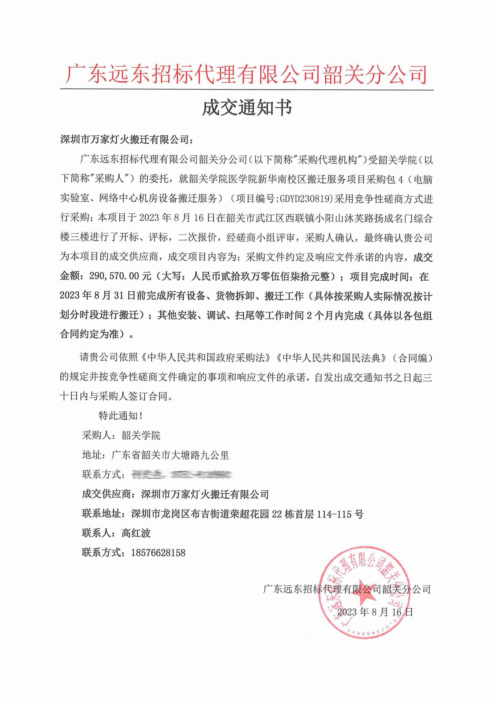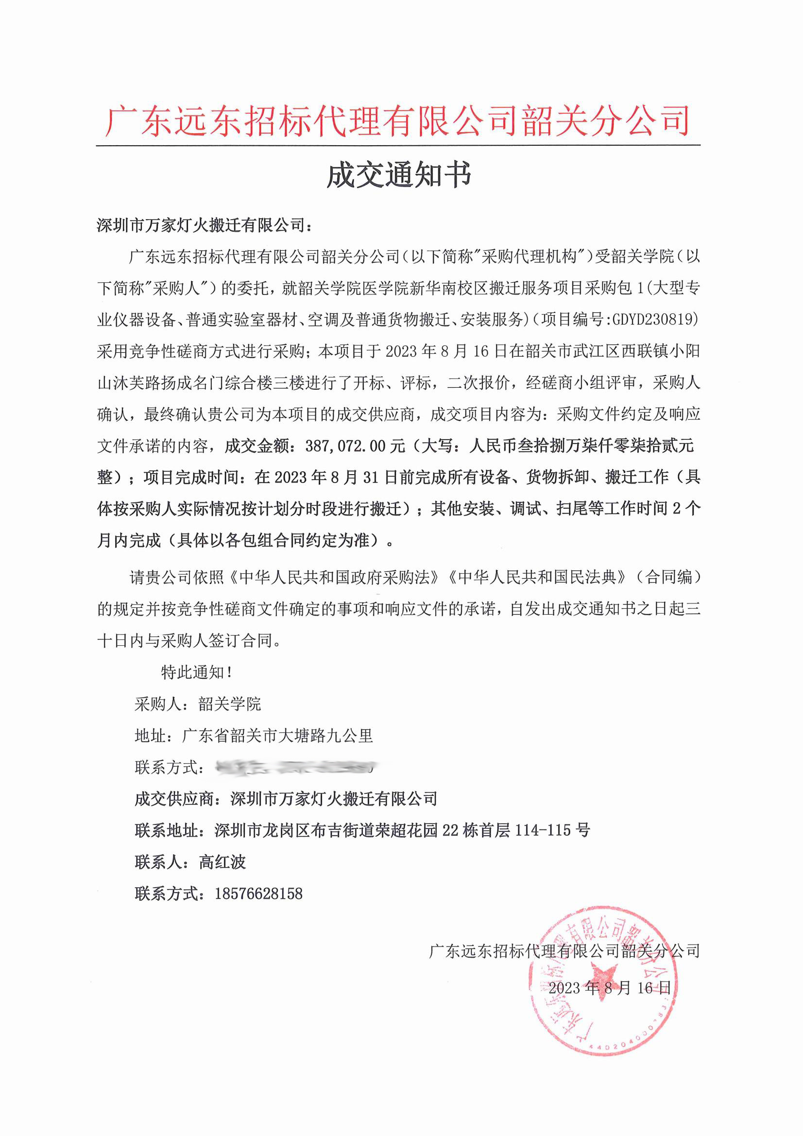 近日,我公司在眾多投標(biāo)單位參與中,憑借實(shí)力成功中標(biāo)韶關(guān)學(xué)院醫(yī)學(xué)院新華南校區(qū)包1和包4搬遷服務(wù)項(xiàng)目。