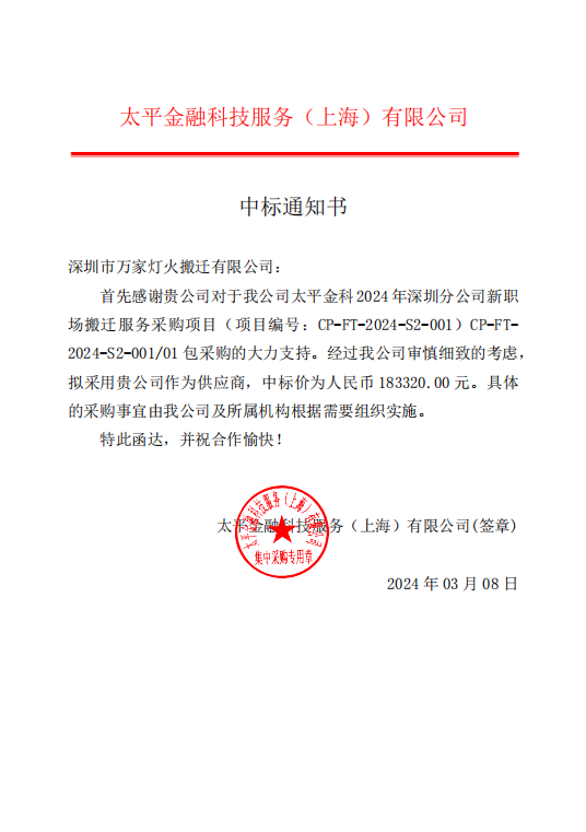我司預(yù)祝本次的太平金融科技服務(wù)(上海)有限公司公司深圳分公司新職場(chǎng)搬遷項(xiàng)目合作愉快。